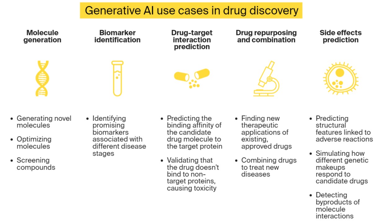 Gen AI algorithms can look for new therapeutic applications of existing, approved drugs. Reusing existing drugs is much faster than resorting to the traditional drug development approach. Also, these drugs were already tested and have an established safety profile.