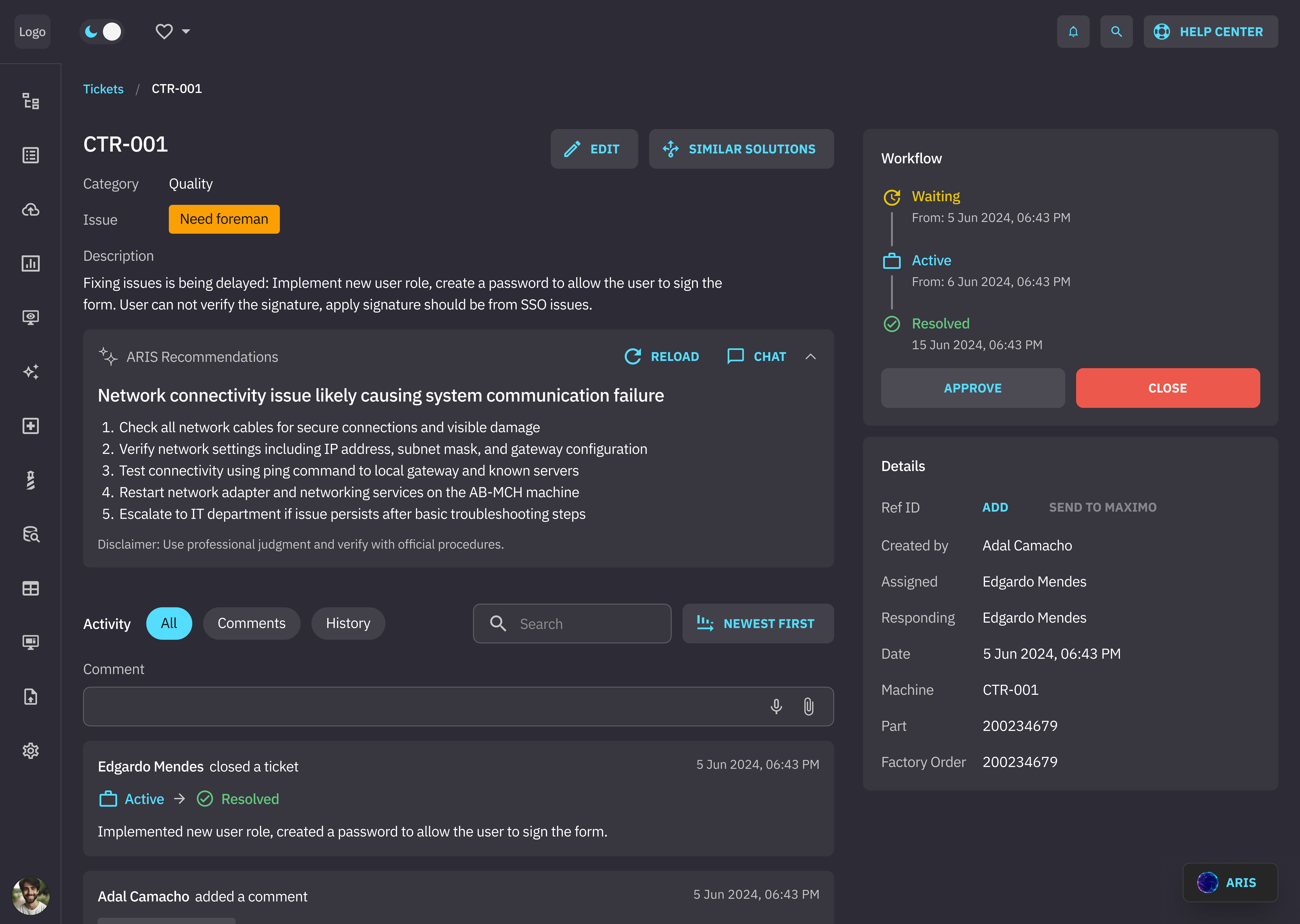 The maintenance team can resolve issues either by searching the knowledge base directly or by asking the AI assistant for recommendations. After receiving the initial recommendations, employees can continue troubleshooting via text or voice prompts. The AI always displays references, such as docs, prior tickets, etc., to support its point.